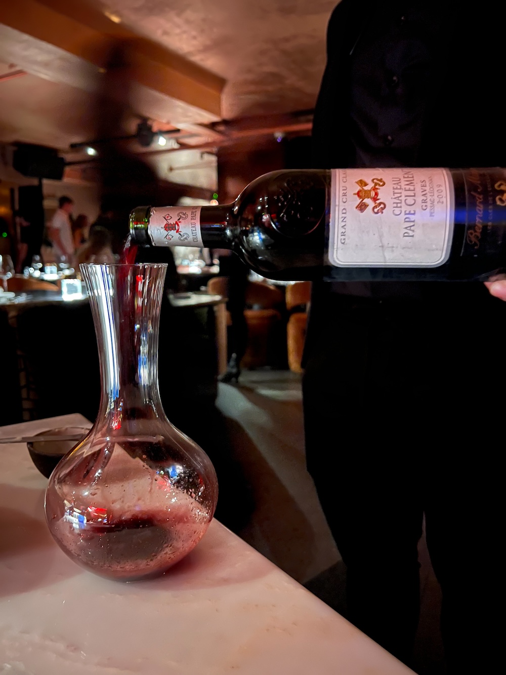 Tienen una lista de vinos interesante con algunos sobreprecios que asustan. El precio por descorche varía y hay que confirmar con su sumiller. En mi caso me cobraron 40€ por una Pape Clement 2009 que me pareció muy razonable ya que ellos proveyeron el decantador y unas copas de alta calidad.