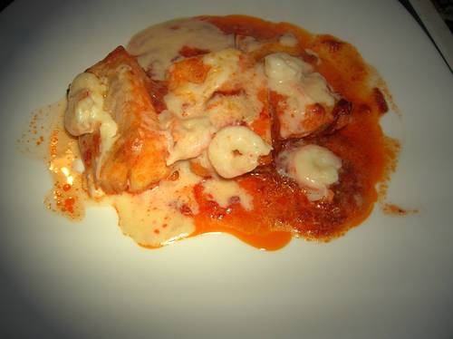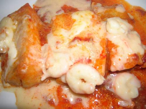 Es importante que el atún quede muy desmenuzado,y hay que echarle muy poquito,es mas que nada una textura que le da a la salsa,y las gambas se le ponen crudas y se hacen al horno enseguida.
