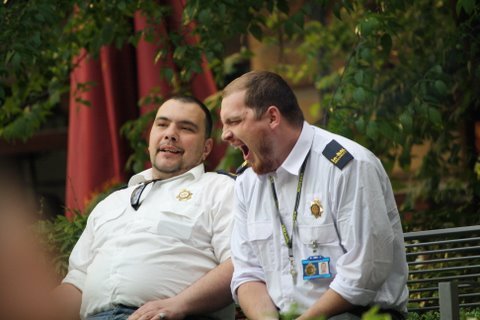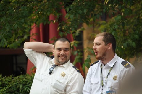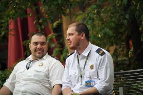 La durísima vida de "poli" controlando que nadie se desnadre en la plaza..... funciona bien el tele, eh?