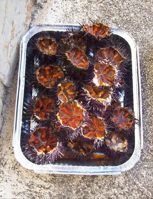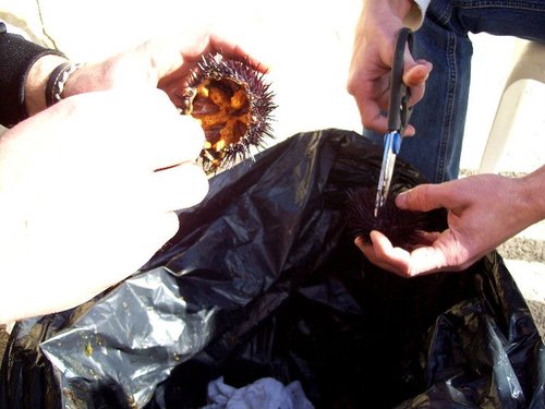 Ya que estais sacando a relucir los manjares de este finde: este es nuestro ágape del pasado sábado, con frío, pero con solecito antes de la llegada de este maldito temporal. 5 quilitos de erizos entre cuatro pax + galeritas y gamba a la plancha.
