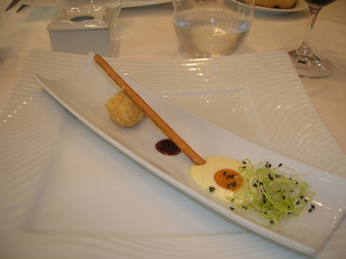 imita un huevo frito,pero la clara es de queso cremoso,con un palito de pan.Chulada total.