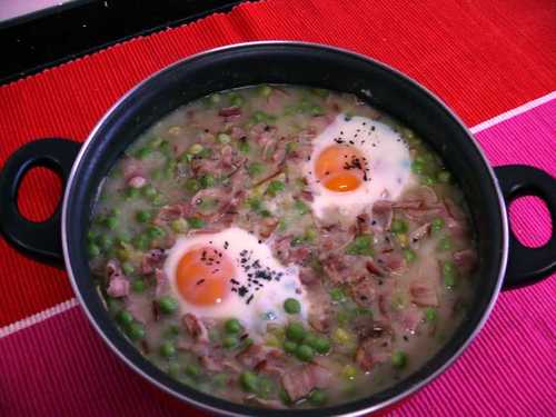 Los preparé como siempre se han preparado en casa de mis padres, se blanquean los guisantes, se hace un sofrito con cebolla, ajo y jamon o bacon como es este caso, se le añade un poco de harina y posteriormente vino blanco, cuando comience a espesar se añade agua, los guisantes y un puñado de perejil bien picado, se retira del fuego y se cascan un par de huevos de los ricos, ricos, no de los que llevan codigo de barras y se rectifica de sal y con esta cena y bien de pan, ya puedo morir en paz.