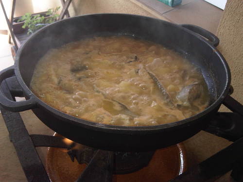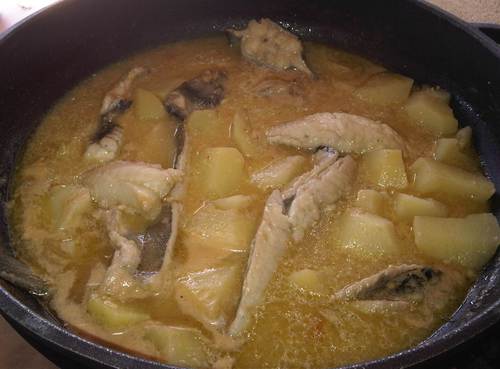Yo hago un poco de trampa ya que utilizo las espinas, cabezas, etc para dar gusto a las patatas, y al final añado algo de pescado del “bueno”.