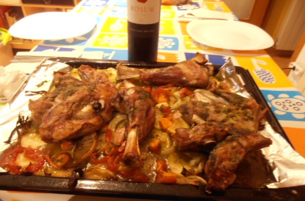 Paletilla de Cordero al Horno, con una buena "cama", en el "zulo" de Pingus y sin su amigo Pinocho. Bueno...aquí por lo menos no sale, jejeje...