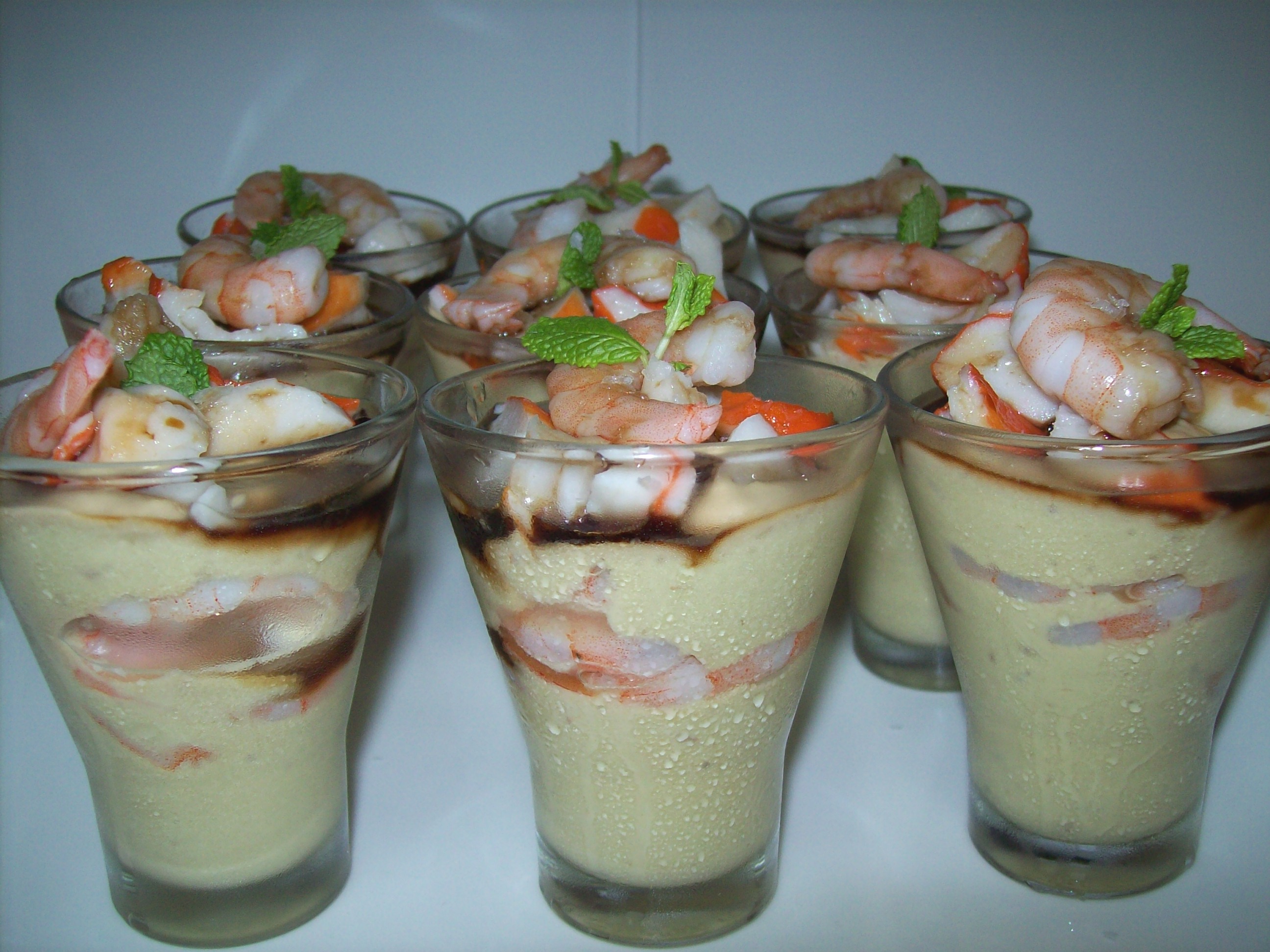 Copita de crema de aguacate con langostinos al ajillo y soja
