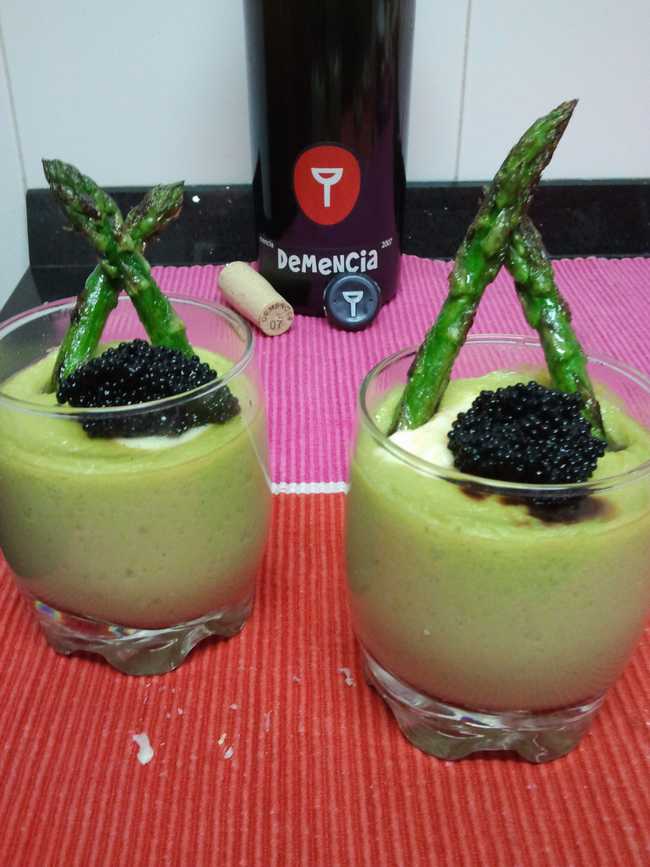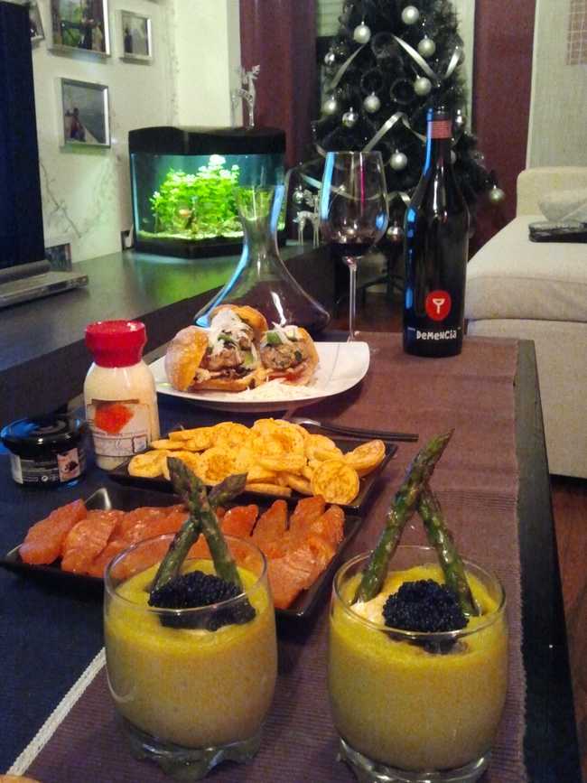 Crema de esparragos trigueros con huevas de lumpo, mini hamburguesas de presa iberica y salmon Carpier con blinis y una especie de salsa tartara.