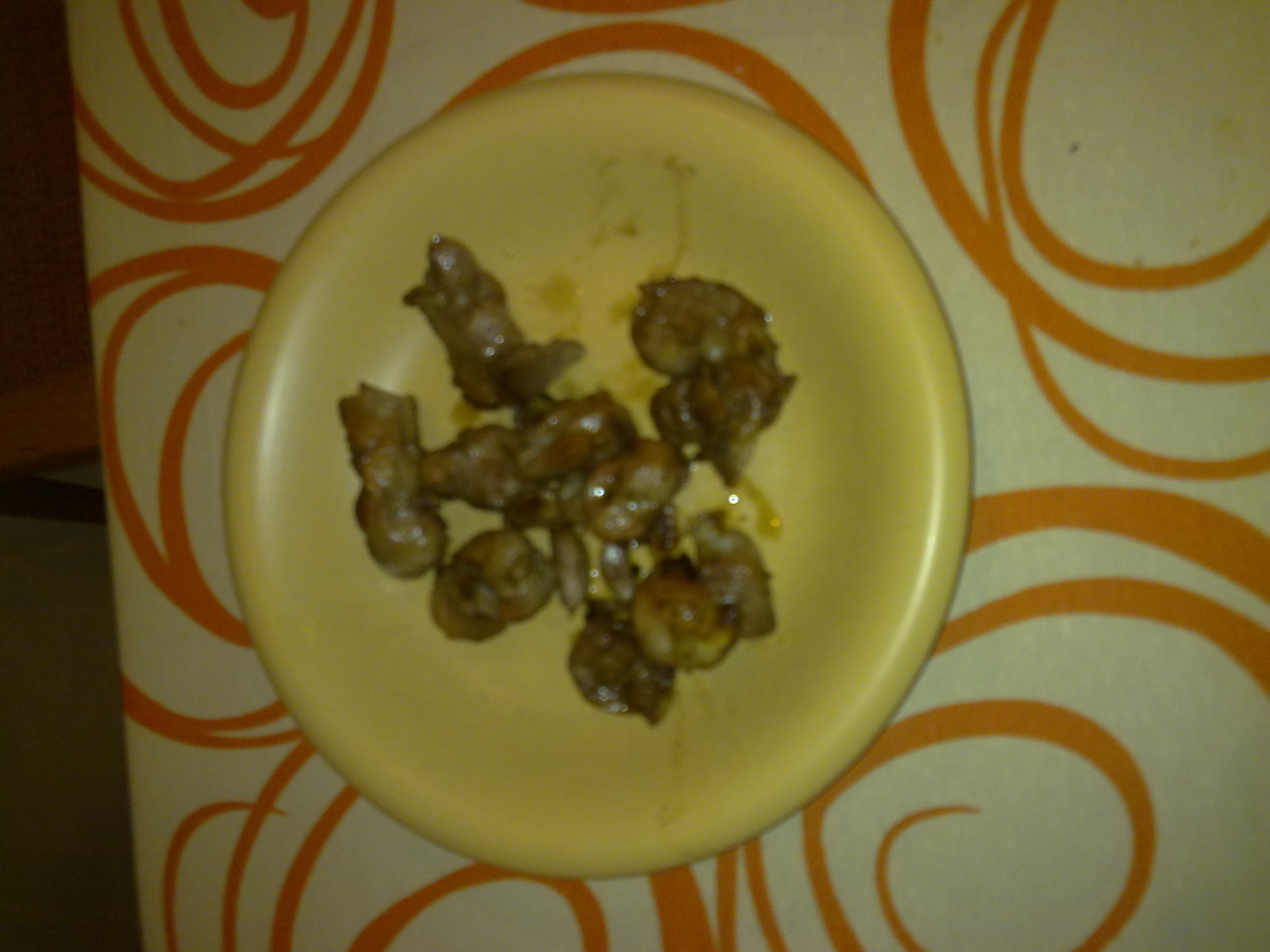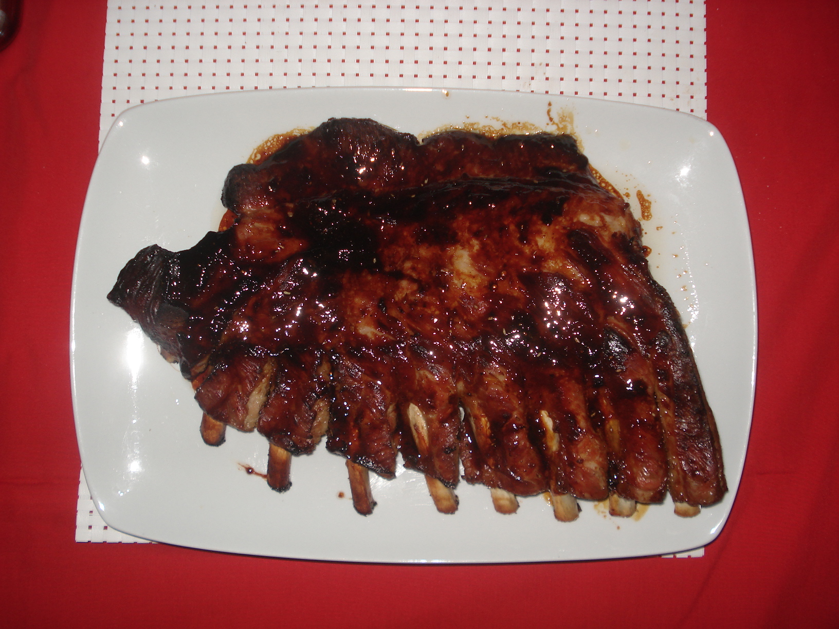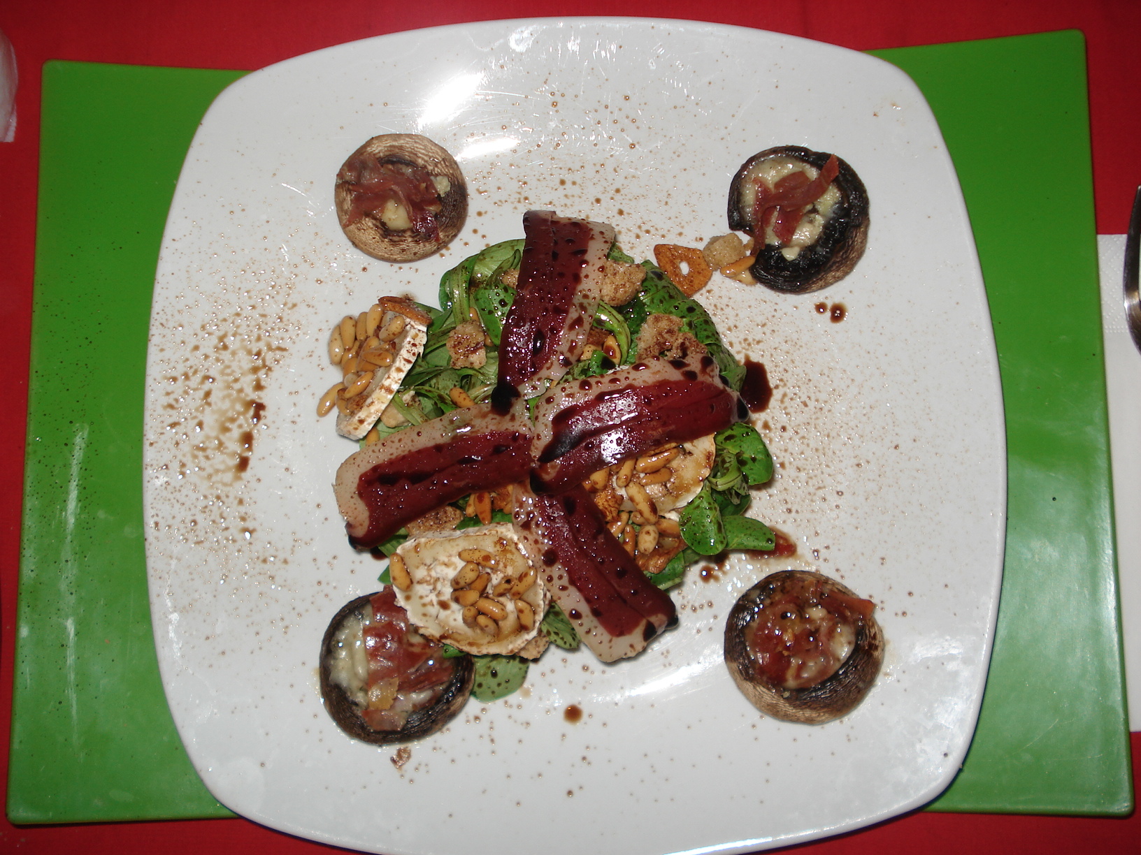 La cena de anoche: ensalada tibia de canónigos, jamon de pato, queso de cabra, ajo y piñones. Un entrante de champiñón al horno con queso y virutas de jamón y un costillar al horno con miel para acabar.