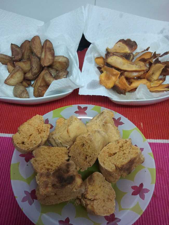 La cena de anoche para acompañar a un Allende 04, patatas gajo con especias, chips de boniato y pan que hicimos de tomate, de segundo, magret de pato con su foie.