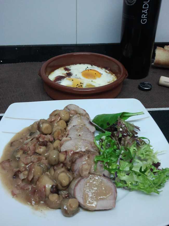 Y una fotica mas, solomillo de cerdo con salsa de cerveza, bacon y champiñones y unos huevos con jamón.