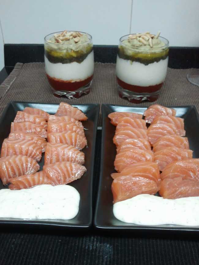Ver mensaje de Obiwan FerranPues ala, lo dicho solomillo laqueado con miel y especias, un poco de salmón La Balinesa y una crema de queso con mermelada de pimientos y berenjena asada.