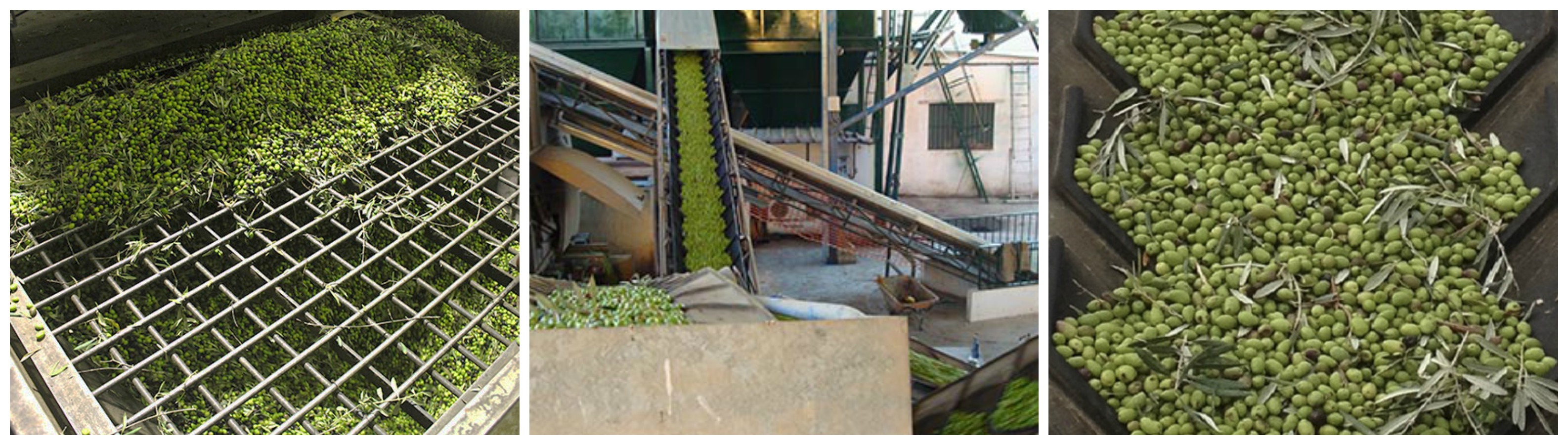 - Patio de recepción: zona donde se recibe el fruto una vez recolectado. Una vez se han seleccionado, las olivas pasan por la tolva donde son limpiadas, lavadas, pesadas y almacenadas, a la espera del siguiente paso: ser molidas. El almacenamiento no puede durar más de 48 horas pues las olivas corren el riesgo de deteriorarse e iniciar la fermentación.