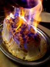 Se trata de la Tortilla Noruega, una barra de helado recubierta de merengue que se introduce en el horno lo justo para dorar el merengue, y acto seguido se flamea con Grand...