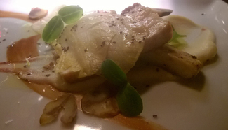 • Pez limón marinado en café y chocolate con crema de apio, endibia belga y castaña