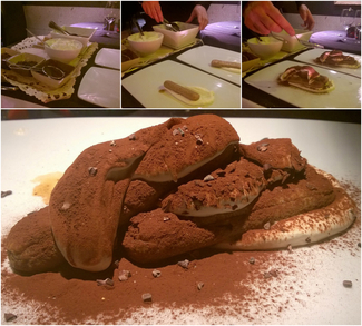 ¡Que llegan los postres! Mis hijas llevaban esperando el tiramisú desde que entraron. Sacaron primero el merengue, rrrrrico, y la sorpresa fue que mientras lo tomábamos, un camarero trajo un carrito, se puso junto a nuestra mesa, y nos preparó el tiramisú sobre la marcha, en directo y por televisión. Los he comido mejores, pero el punto efectista del tema lo hace inolvidable.