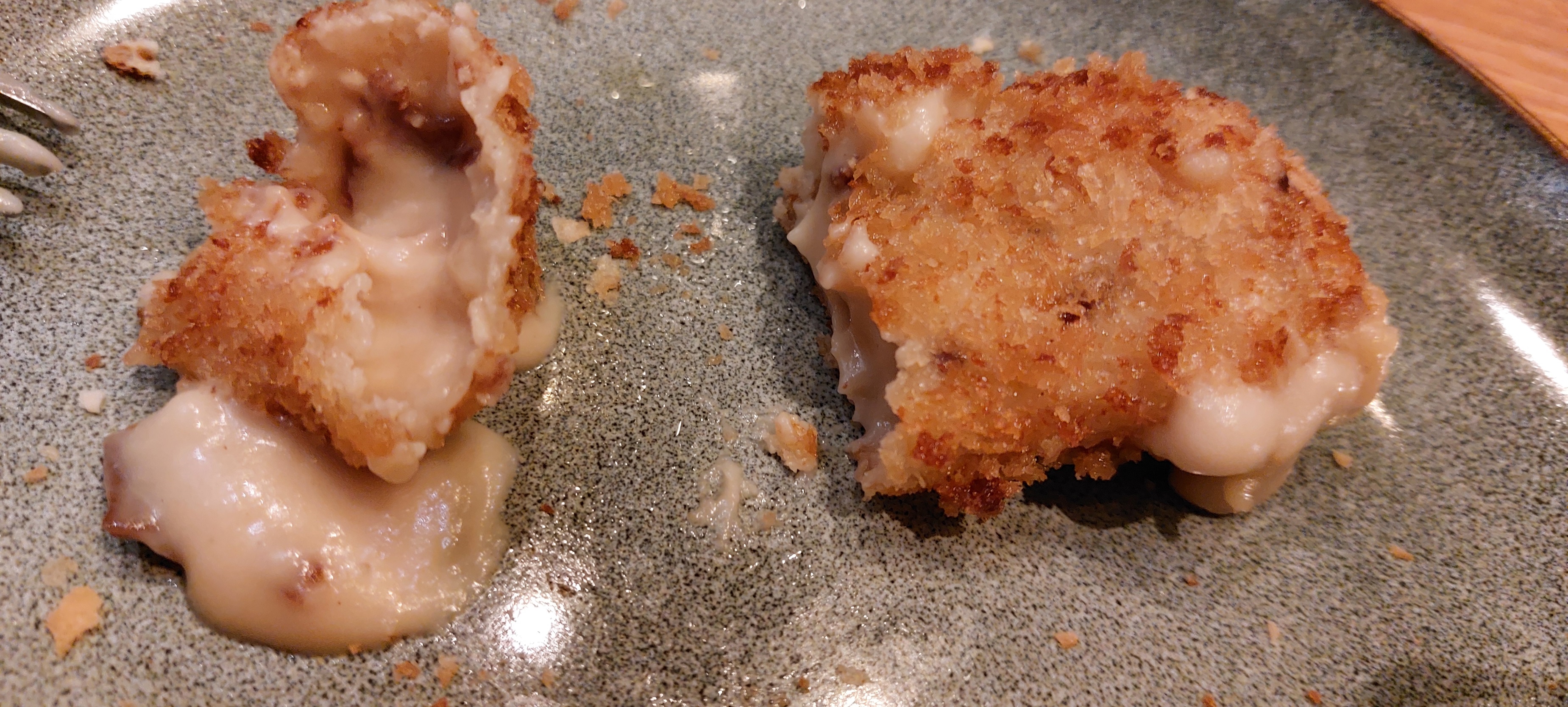 2 Croquetas de jamón.- buen tamaño, rebozado crujiente e interior meloso.