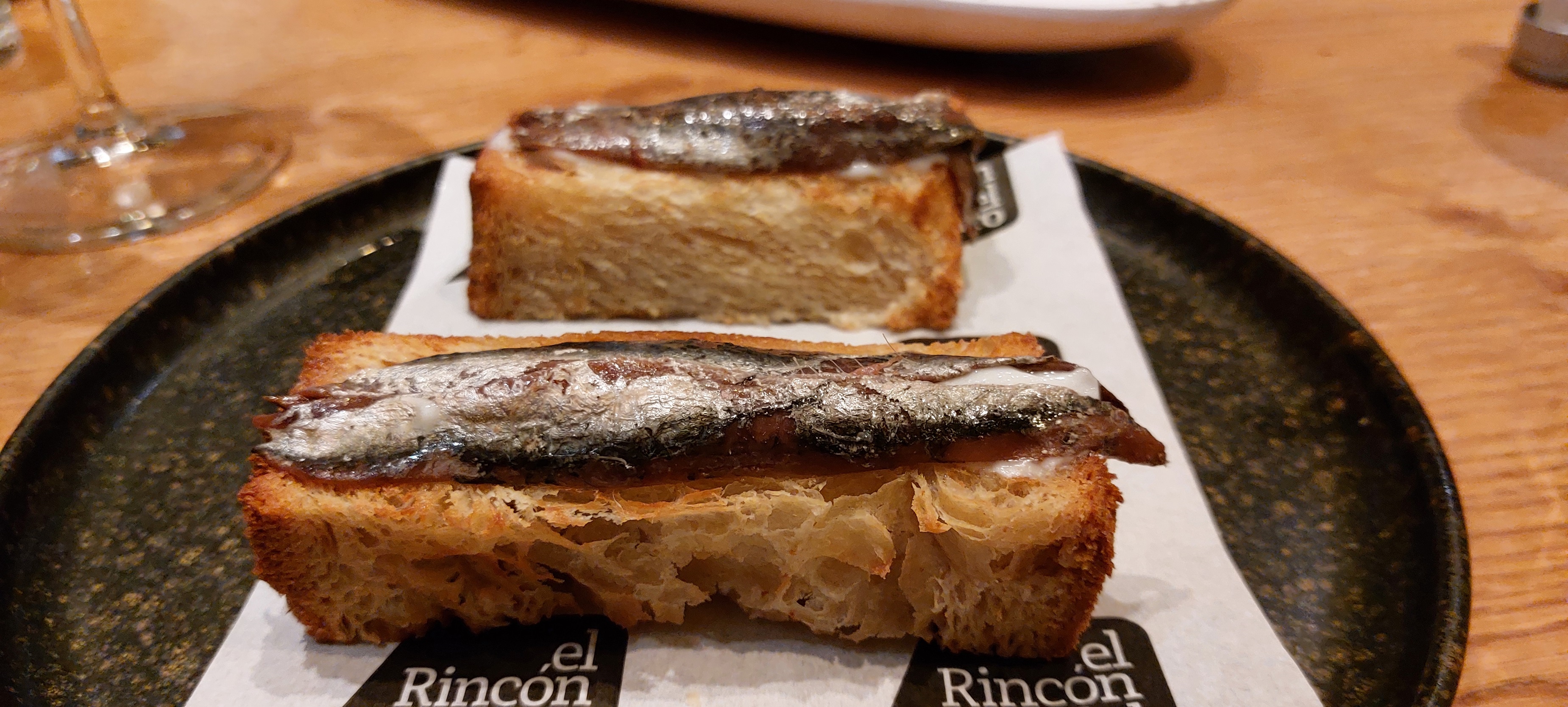 2 Torrijas de anchoa.- Muy buen pan, mantequilla de leche de cabra y anchoa de bota, lo mejor de la noche, que sabor, platazo.