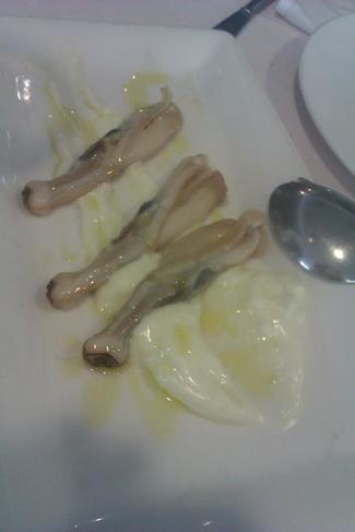 Una cosa que no había probado nunca, longeirones, bivalvos parecidos a las navajas, pero en vez de conchas curvas, la concha es recta y de un color mas claro, el aspecto del interior es parecido, el sabor es mas fuerte e intenso, hay que tener cuidado al hacerlo, ya que es mas delicado que la navaja y si te pasas lo jodes y se ponen muy duros , ni que decir que estaban perfectamente ejecutados, sorpresa grande, me gustaron mas que las navajas, 12€ ración.