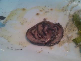 Lamprea rellena, mi primera vez con este animal acuático, relleno y cortado como un fiambre, sabor potente y distinto, 14€ buena cantidad para dos personas.