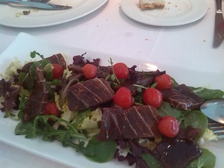 Ensalada de atún, con tomates cherri, sin piel y mezclum, buen color y buen sabor, y una constante en los platos de Sabino, protagonismo para el pez, domina el plato, en cantidad y en sabor, 14€.