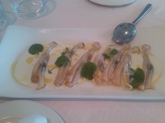 -Sardinas marinadas: Pequeñas sardinas con un profundo sabor y una textura totalmente sedosa. Venían acompañadas de unas hojas de lechuga. Muy buenas.