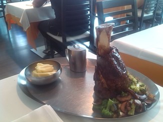 Y para rematar el famoso jarrete al estilo Santi Santamaría, sabor delicado, textura de mantequilla, acompañado de puré de patata con mantequilla y brócoli y champiñón a la plancha, encantado de volver para comer esta carne.