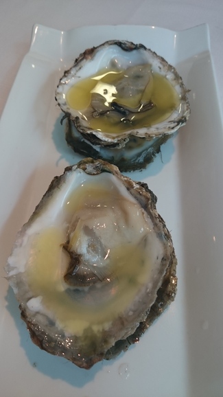 A continuación un par de ostras, ligeramente escabechadas, lo justo para darles un poco de temperatura, pero para que el sabor a mar siga intactisimo, por cierto dos euros cada ostra.