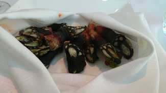 - Aperitivo de cortesía: mejillón servido en su concha con verduritas cortadas y aliñadas al estilo salpicón. Fresco.