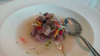 Ceviche de pez ballesta, cebolla, cilantro y leche de tigre, buen y fresco pescado, preparado al momento, perfecto, 14€.