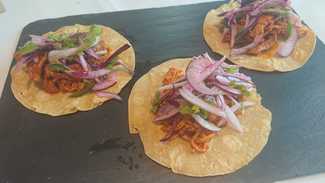 Tacos de cerdo celta , estilo mexicano-gallego , “cochinita pibil” , algo de carne teníamos que probar , y el jarrete , que lo borda , aprendió de Santamaria , es demasiado para este final , 3 tacos majos , 12€ .