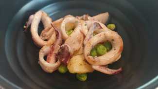Luras.., chipirones los llamamos por aquí , troceados , salteados con cebolleta fresca , guisantes de la zona y patata nueva , 15€ , productazo .