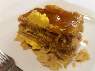 De postre Tartas de hojaldre finas, sin cremas, con un ligero toque de mantequilla muy suave. Las dos estaban estupendas.