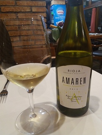 Sabemos que aquí también se le da importancia al asunto de los vinos. Hemos charlado un rato con el propietario que es el que atiende la barra y me comenta, cosa que ya sé, que la “audiencia” en general pide blancos de año, los pide helados…. Yo quiero algo más “viejo”, con algo de crianza y con su temperatura. Así que me recomienda un Amaren. El pensaba que tenía un 2011 pero se conoce que por lo menos alguien bebe como yo y el que tiene es el 2013. Un vino fermentado en barricas nuevas de roble francés durante 8 meses. Lleva la Viura como uva principal y un 15% de malvasía. Creo que incluso puede aguantar algún año sin problemas, aún se nota un poco la madera pero está muy agradable. Algo de fruta pero se nota mucho esa crianza. Incluso Marijo que es de vinos más jóvenes y afrutados me comenta que le gusta. Además este tipo de vino “puede” muy bien con esas patas y con esa carne.