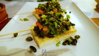 Empezamos con unas Brochetas de Gambón con Verduritas, destacando la frescura de las verduras empleadas, y la textura de cocción del gambón.