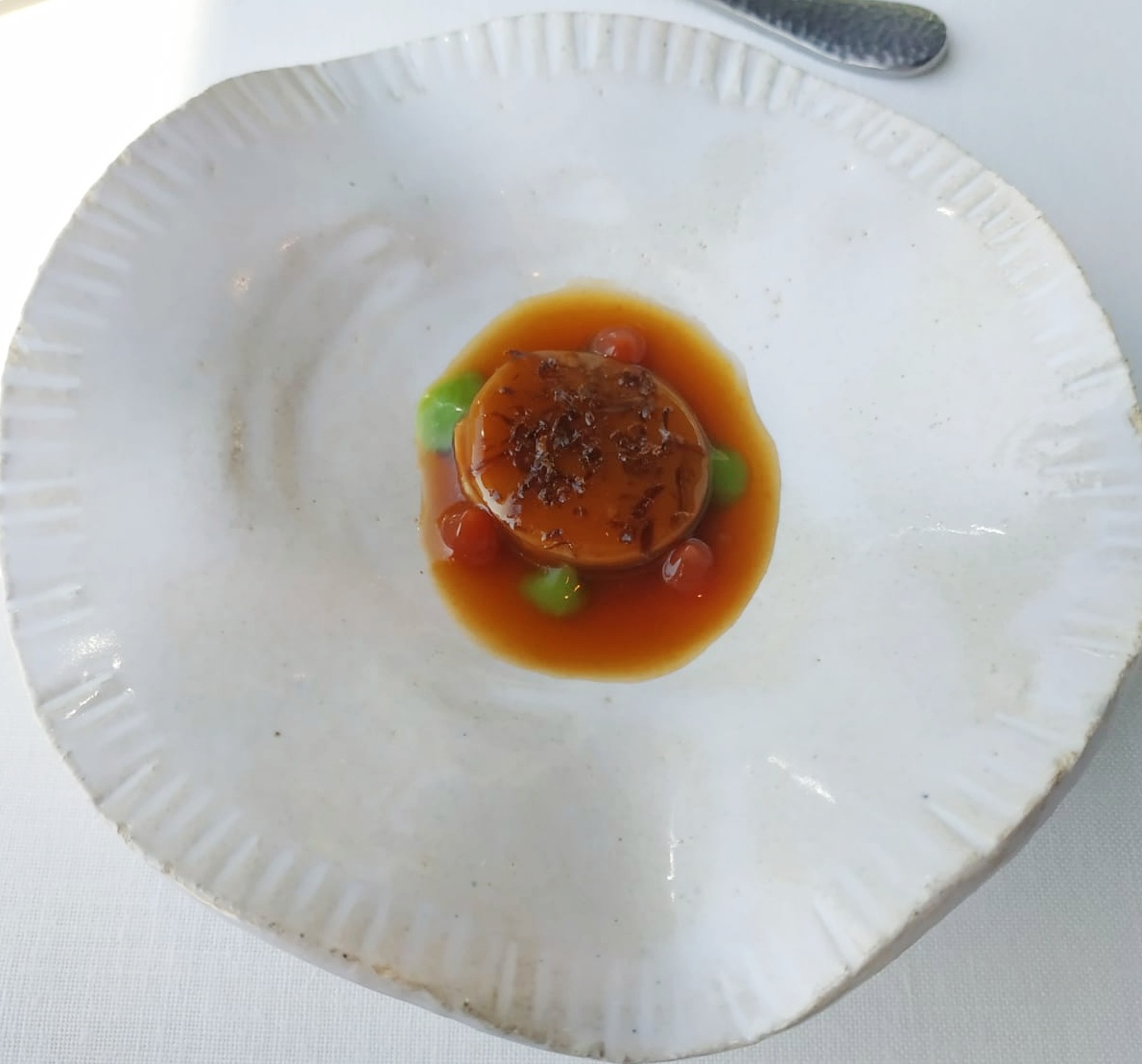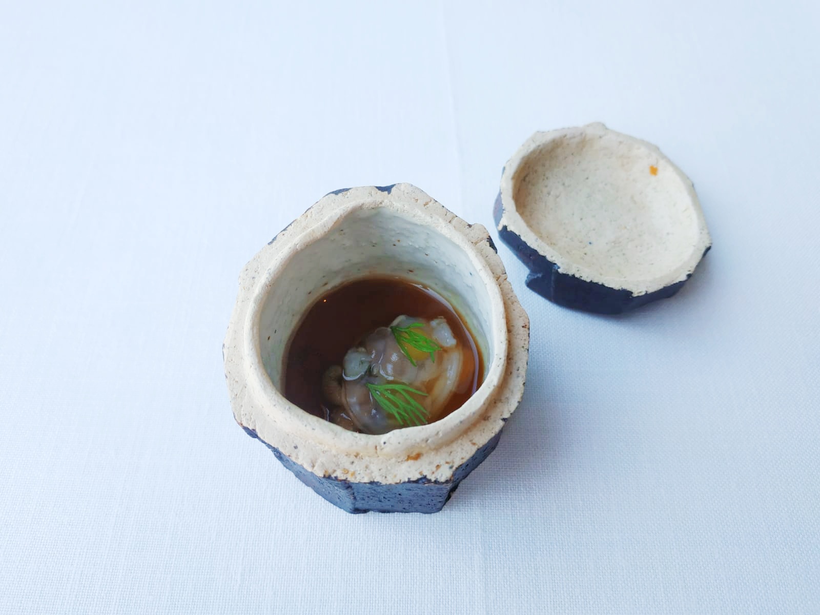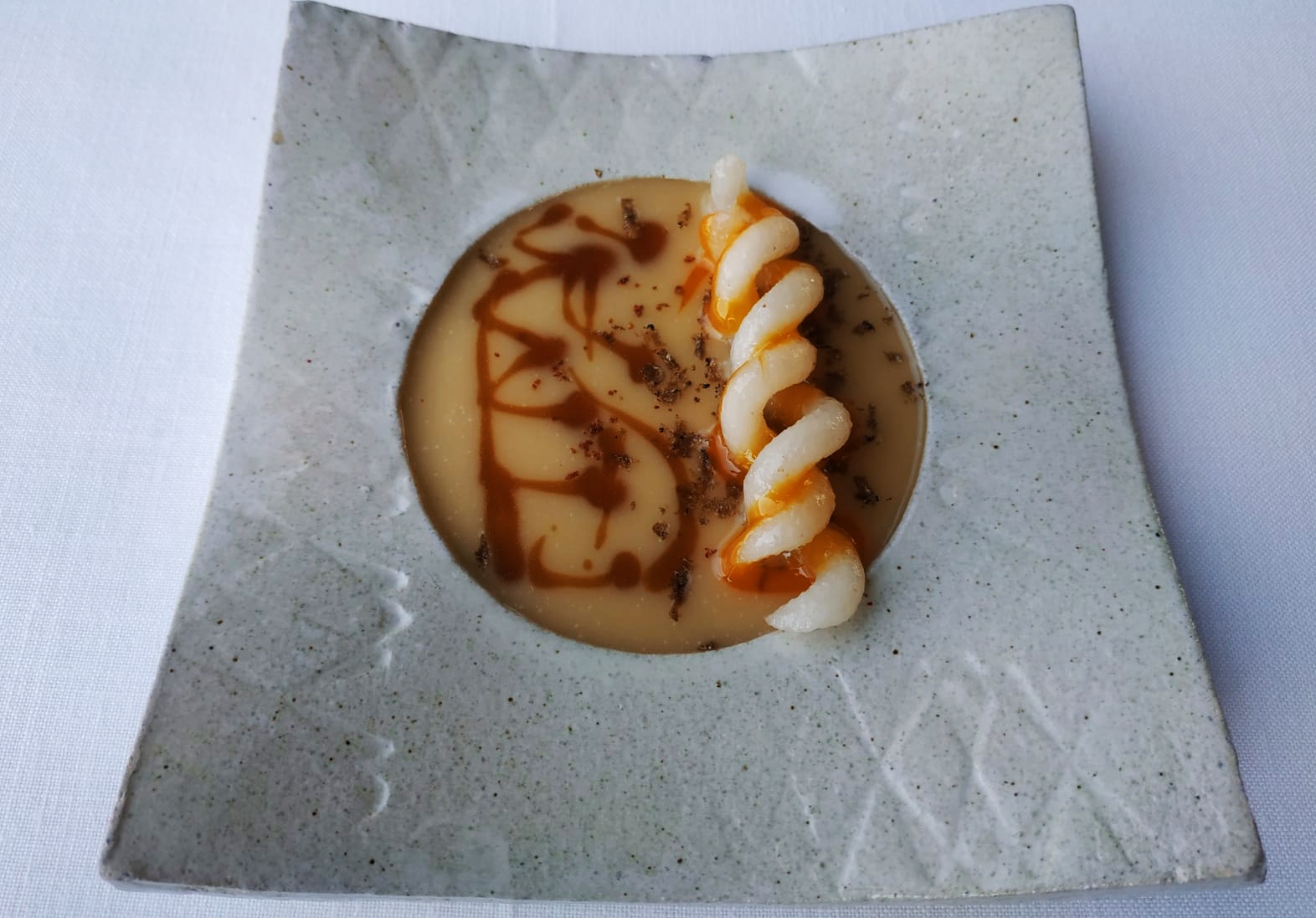 Cigalita de playa braseada, natillas de su coral , caramelo de crustáceos y emulsión de yuzu , además acompaña un infusión de la cabeza y cuerpo de la cigala con lemon Grass , jengibre y cilantro , buauuuuuuuuuu.