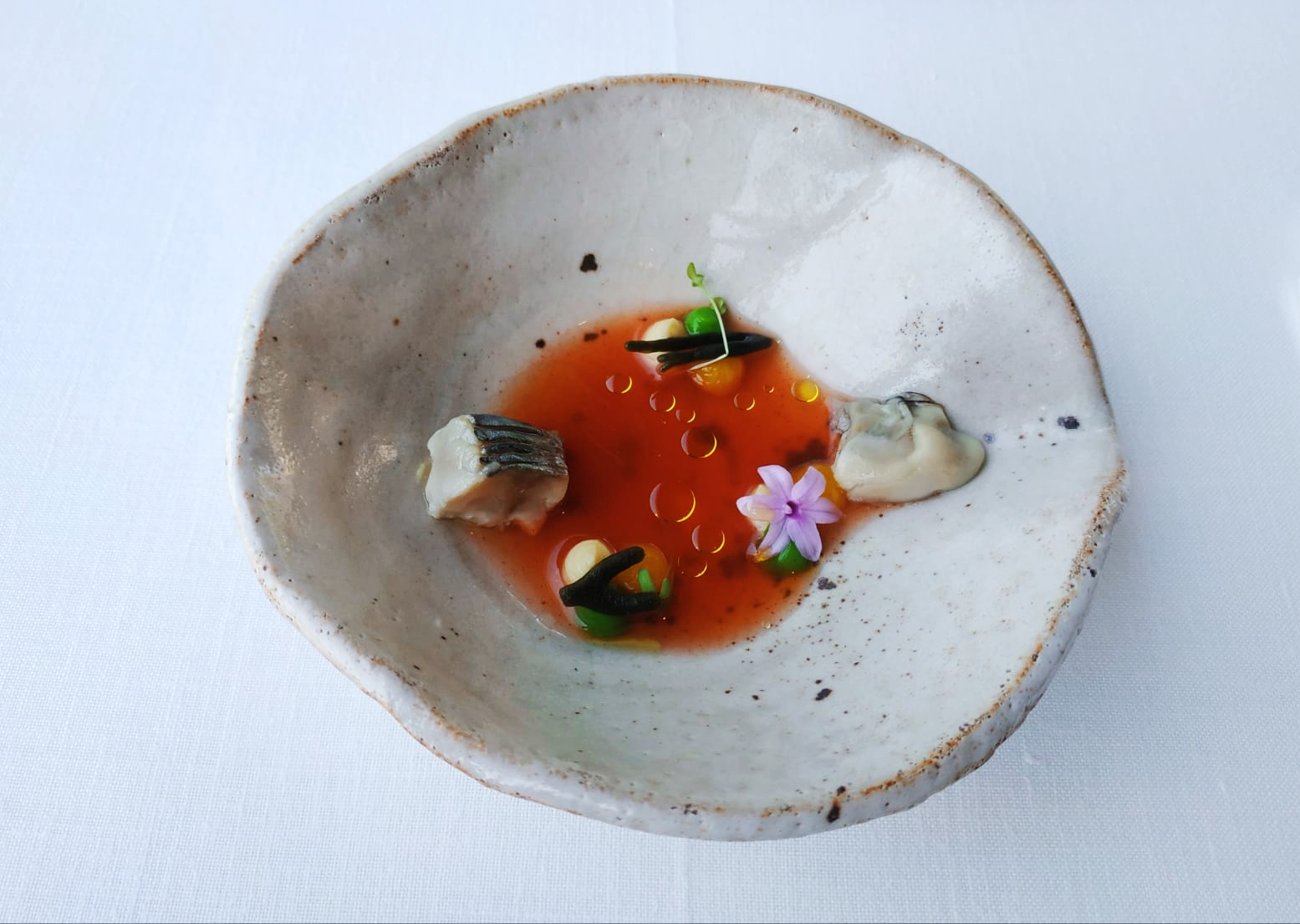 - Caballa al vapor con aguacate, boniato, gel de limón con caldo agripicante y hoja de ostra: Taco generoso de caballa con una textura de las que te hacen conmover. Aquí se nota la mano del cocinero y, seguramente, de quienes le han enseñado a prepararla. Se acompaña con un caldito con mucha personalidad: realmente pica. Admiro esas notas de riesgo y atrevimiento del cocinero versus una cocina más para todos los públicos. Bravo.