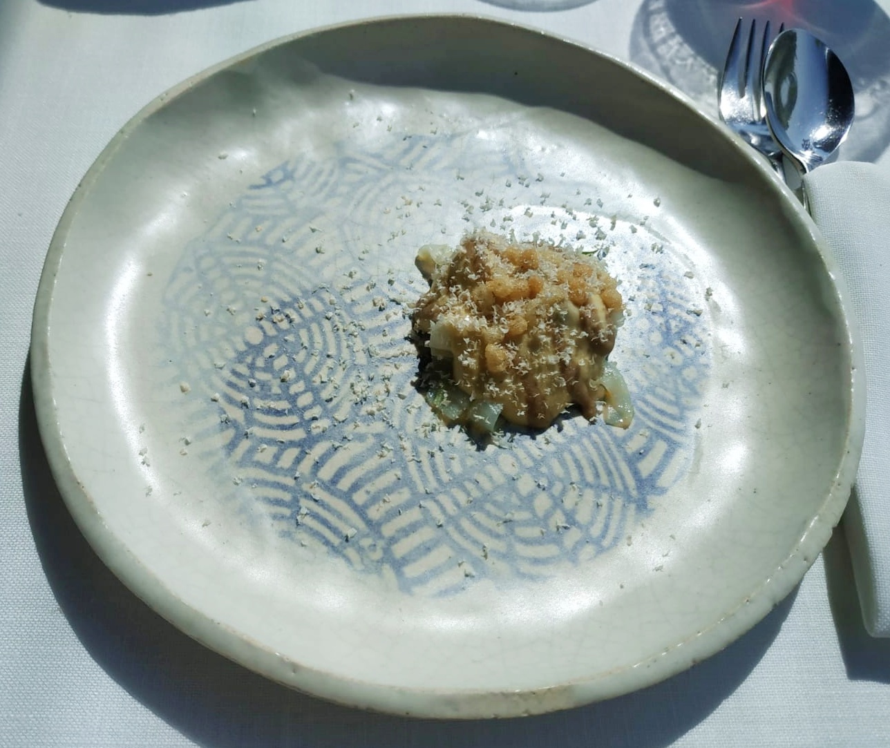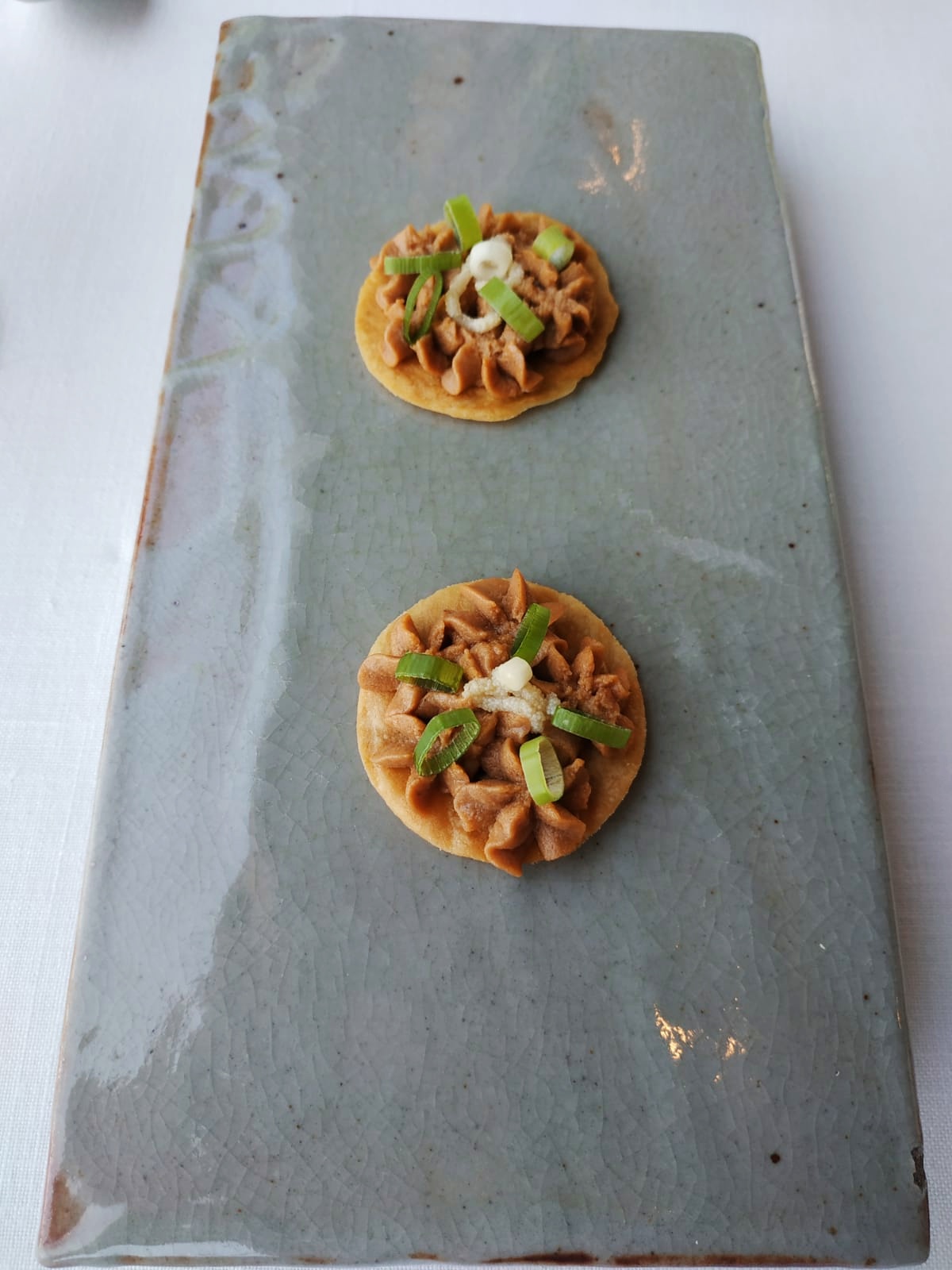 El segundo snack de bienvenida es una flor de Denton , se usa el método japonés ikejime , se separa la sangre carne del pescado , resulta una carne mas blanda , mas jugosa , se acompaña de unas semillas de pomelo nítricas , para refrescar el plato y unas perlas de colatura de pescado , un pequeño bocado lleno de técnica y sabor.