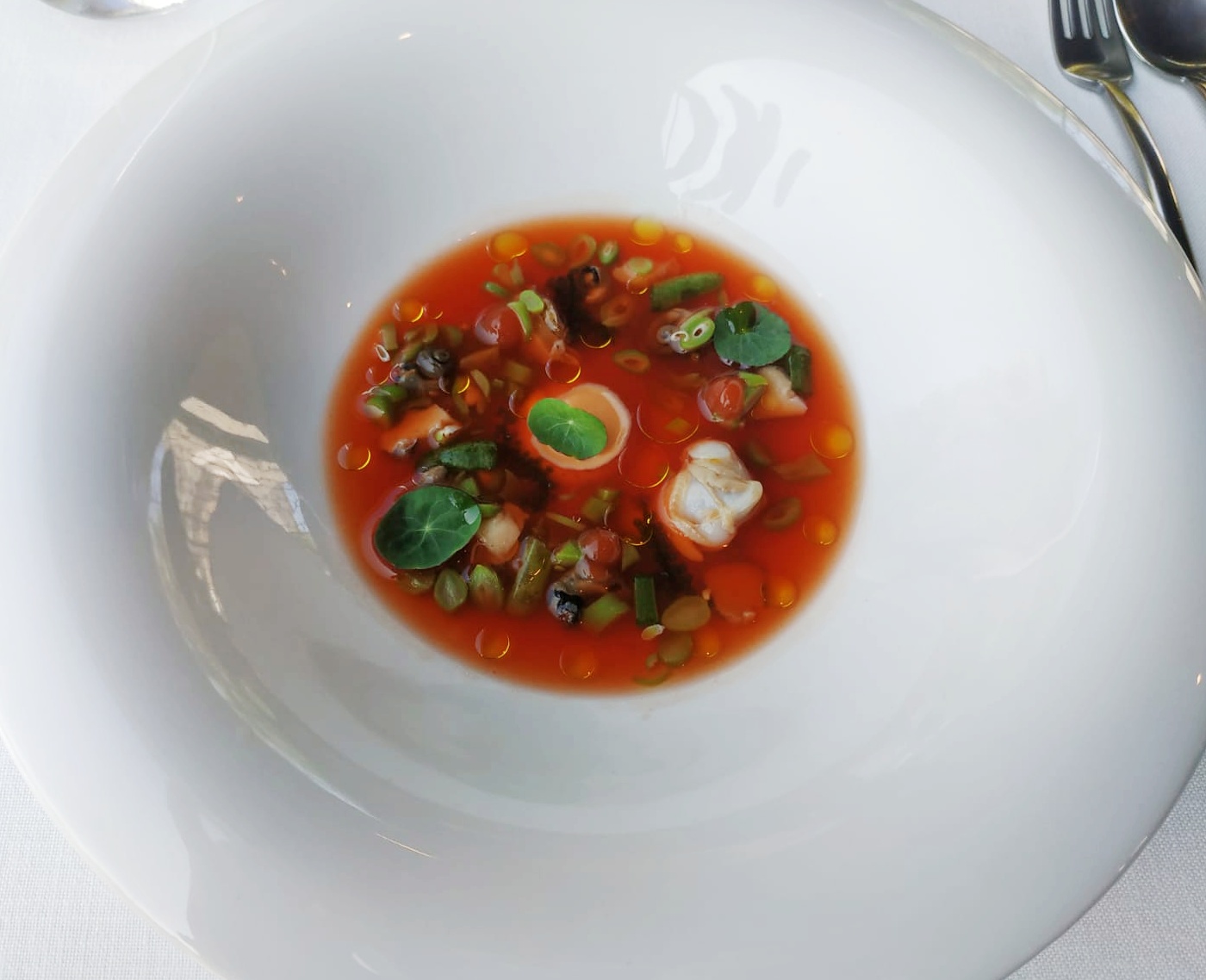 Quisquilla pasada por el humo de brasa, durante escasos segundos, le da un poco de untuosidad, pero prácticamente crudo, como mejor sabe esta materia prima, acompañada de un gazpachuelo de vegetales crudos , emulsión del coral de la propia quisquilla, crujiente de maíz y suspiro de mar , una hierba de costa , wonderfulll.