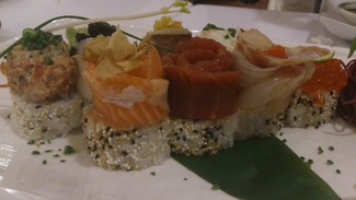 Kitsume roll: Disposición de los uramakis similar al plato que le precede pero con la coronación diferente que supone el uso de pescados frescos totalmente crudos. Mucha similitud con el sashimi: atún, caballa, pez mantequilla, tratar de salmón… Dificultades a la hora de ingerirlos de un solo bocado, Hay que “desmontarlos” y se pierde un tanto el encanto.