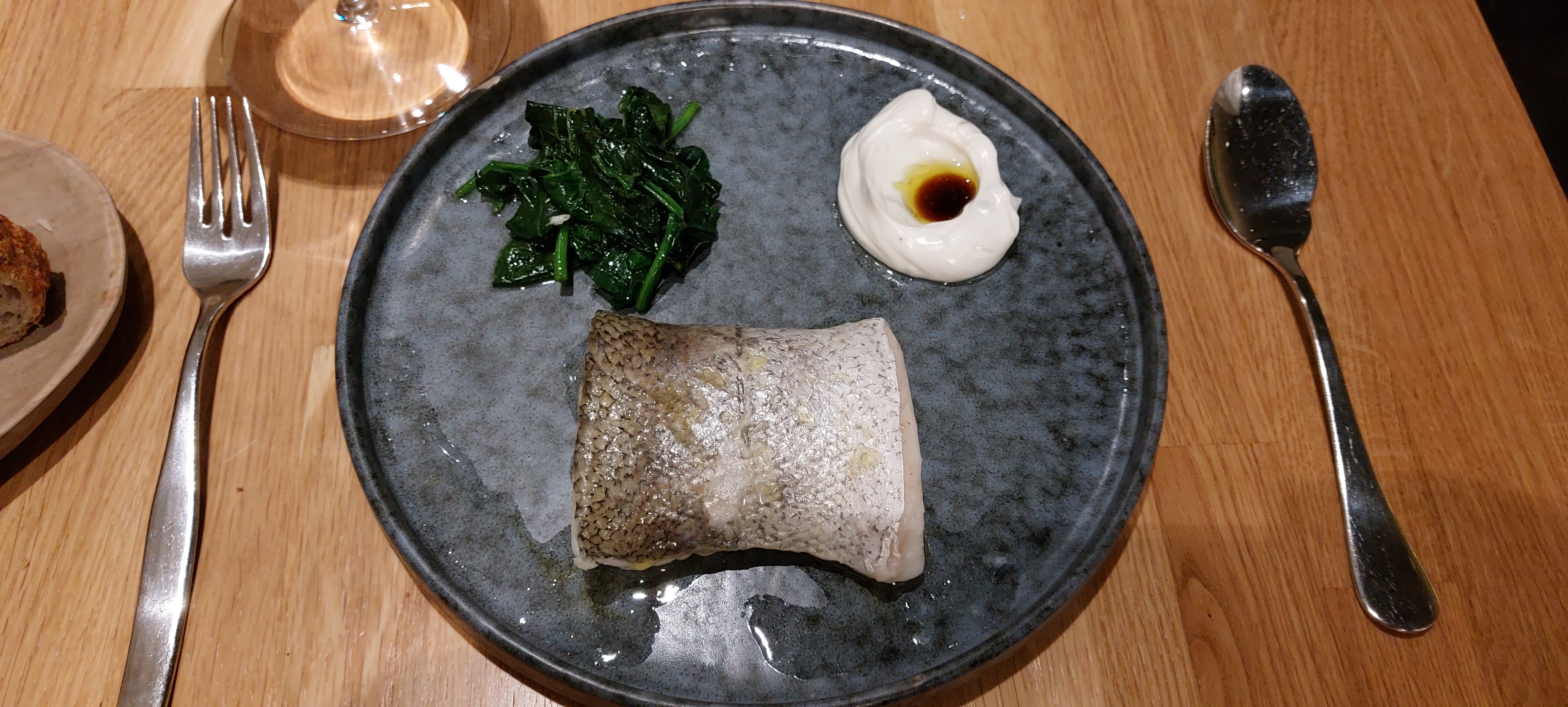 2 Merluzas cocinadas a baja temperatura, perfectas de cocción y acompañadas de espinacas y pil pil de lima y limón con soja. Para repetir hasta reventar, plato pobre en presentación pero no necesita más.
