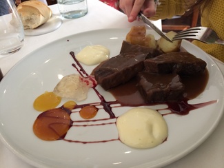 Con el foie de las manitas, las mermeladas pueden pegar, pero con la carrillera al vino, no. Me sorprende que utilicen las mismas salsas, creo que el plato pierde algo de personalidad, al margen de esto, las carnes tiernas y gustosas, las manitas con bastantes huesos.