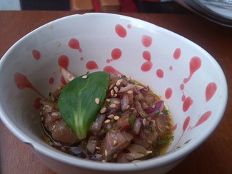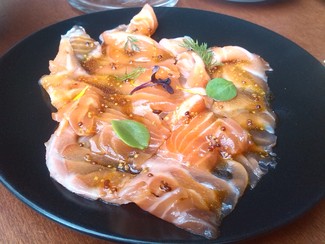Carpaccio de salmón, para mi lo mejor junto al ceviche de lubina , ambas elaboraciones parten de pescado fresco y aderezado el salmón con soja y al estilo japo y el ceviche, pues al estilo ceviche, cítrico y especiado, cebolla roja y cilantro, ambos platillos muy frescos, el de salmón a casi 4€ y el ceviche 3,20€.