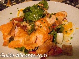 ─ Ensalada de salmón (1 x 12,00€). 8/10. Sobre la base de una ensalada con trozos de pan, huevo duro y espinacas sirven un filete de salmón con un excelente punto. Se rompe, se mezcla y excelente.