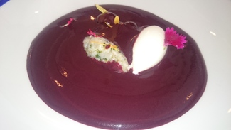 - Gazpacho de cerezas con tartar de langostino y helado de genjibre. Plato soberbio.