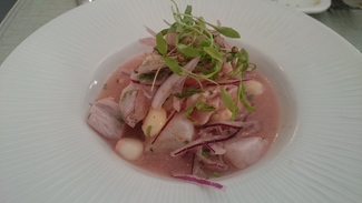 Ceviche de corvina con su leche de tigre y choclo, cilantro y cebolla roja, muy rico me gustan los ceviches, nada que objetar, también media ración 9€.