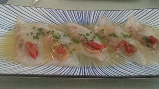 Tiradito de dorada con vieiras, tobiko y yuzu.