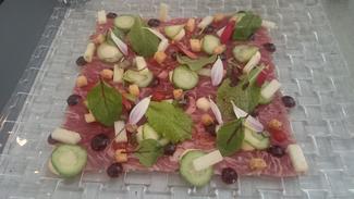 Carpaccio de presa ibérica, salsa hoisin, mayonesa japonesa mermelada de tomate, pepinillo chino en rodajas y varios brotes, hojas de mostaza , acelga roja y flores , este plato para mi destaco por encima del resto, rico también.
