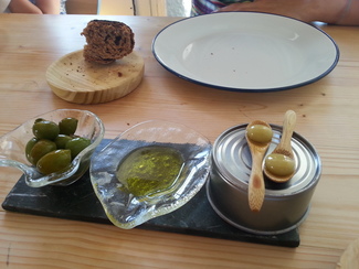 A continuación nos sirvieron el pan, que iba a acompañar la comida, elaborado con trigo, centeno ecológico y agua de mar y una degustación de aceite de oliva y de unas olivas esferificadas. El pan excelente y el resto bueno.
