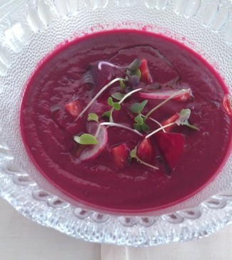 - Gazpacho de remolacha con tropezones de frutos rojos - Suave sabor terroso de la remolacha con la frescura de las fresas. Nada agresivo, muy agradable y fácil de tomar.