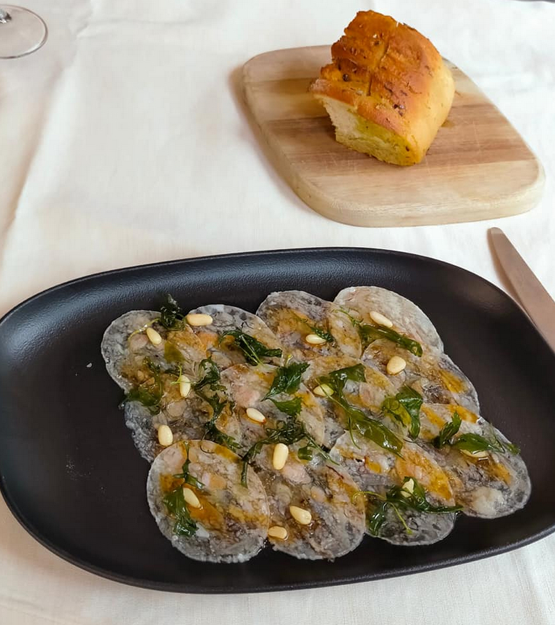 - Carpaccio de peu de porc amb pinyons i focaccia d'oli d'herbes - Deliciós.