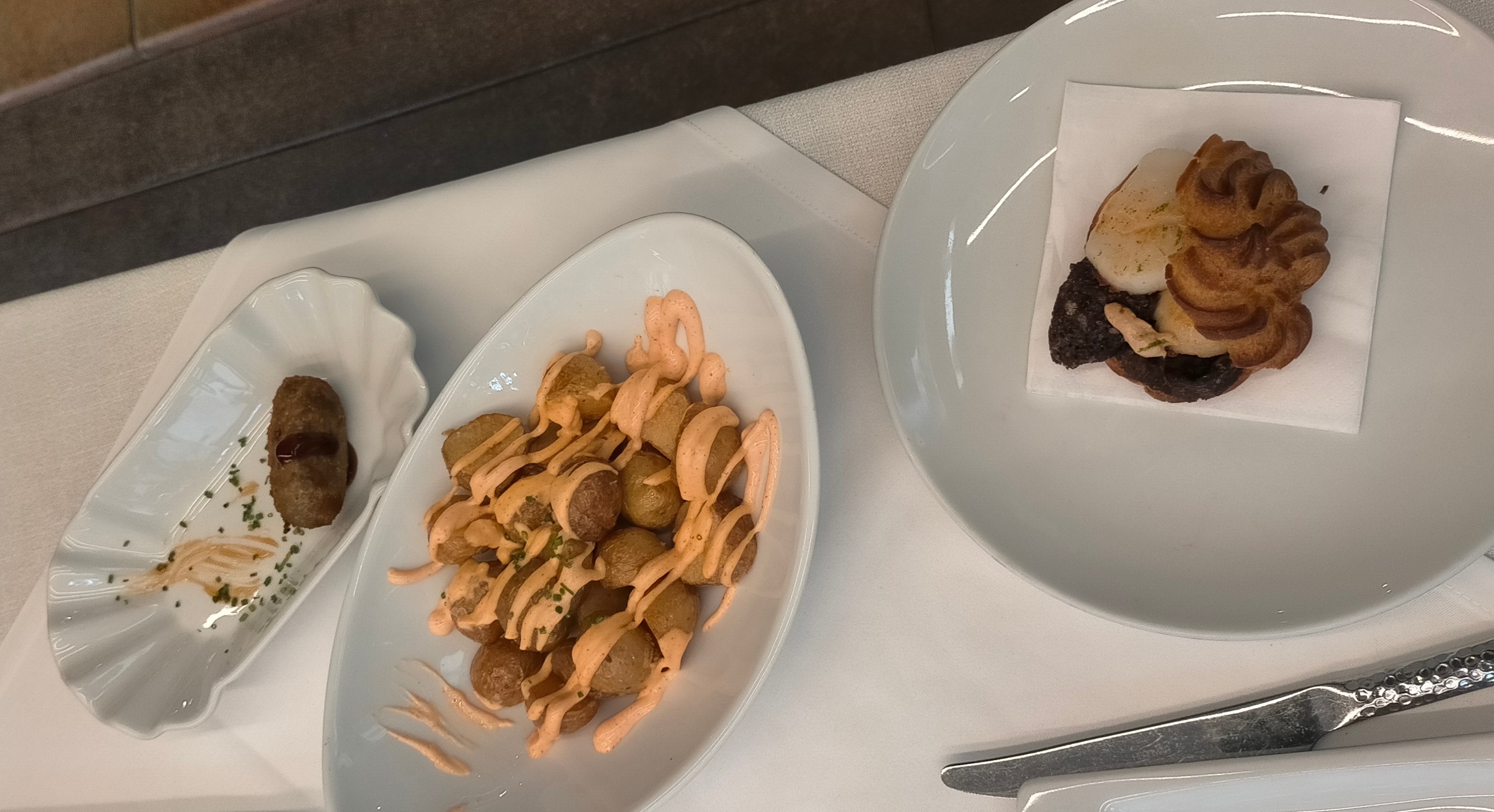 -Trio de tostadas de pan de coca, una de anchoas, otra de boquerones en vinagre con pepinillo encurtido y otra de paletilla ibérica, dos gambas frescas de buen tamaño al ajillo, con el cuerpo pelado dejando la cabeza y la cola, y dos muy buenas croquetas de chipirón en su tinta, este plato tenia un suplemento de 5 €, valió la pena pagarlo.